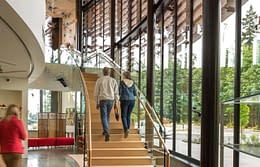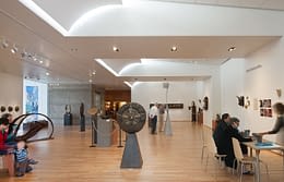 Matthew calls it “the white box effect”- that feeling of disorientation you get in an all-white museum with no natural light. He steadfastly maintains that there is none better than natural light to view art and is enamored with the inherent dilemma that it is also this same light that risks damage to the artwork. To solve this dilemma he designed long strip skylights on the uppermost level of BIMA. This allows the gallery to transform throughout the day in response to the amount of light streaming through the windows. To avoid damage to the artwork, he designed curved baffled light shelves that float underneath the skylights. Natural daylight flows into the space through these skylights, is diffused as it bounces from the light shelves and disperses into the gallery to create a pleasant ambiance.