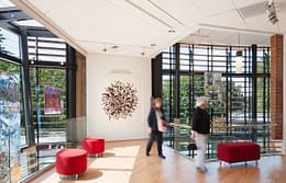 As the sun moves around the building, louvers shift automatically, responding to the location and intensity of the sun in the sky. The louvers are controlled by a series of light sensors that trigger them to open and or close. This allows natural light to filter into the building without damaging the art.