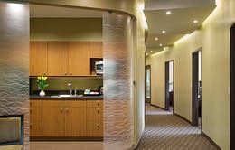 This doctor’s suite is a tenant improvement project consisting of four medical sleep rooms, control observation room, reception and waiting area, offices, and retail space. A custom-designed retail wall, a colorful palette inspired by nature, and a curving corridor with custom night sky lighting bring a unique feel to this medical facility.