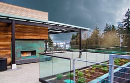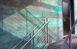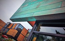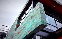 Its richly-detailed copper patina, beautiful indigenous gardens, and nationally-recognized sustainable features complement the surrounding environment and invite visitors to come shop, eat, and play.Copper was chosen for the exterior cladding to provide distinctive color and texture to the building’s massing. The copper suggests a natural and textural juxtaposition to the building’s horizontal ironwood siding and elegant concrete base. The building was designed to be a sophisticated and distinctive neighbor to the adjacent Bainbridge Island Museum of Art, and the use of copper created an interplay of exterior volumes between the two buildings. The client’s desire for little maintenance, longevity, elegance, and distinctive appearance made copper an obvious choice.