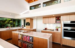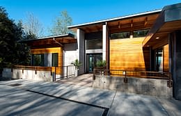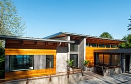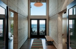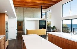 Upon entering the house, visitors travel across a bridge and through a concrete corridor that divides the public and private realms. The south side contains the living/dining/kitchen area on the main floor and downstairs holds a recreational space while the north side contains the master suite and additional bedrooms. The homeowners were a young family, searching for an open concept plan that maximized their stunning, 180 degree view of the Puget Sound. One of the owners is a cabinet maker and she was able to showcase her talent within the beautifully day lit kitchen space. This home was custom tailored to the family and Coates Design hopes that they will continue to love and enjoy the space for many years to come.