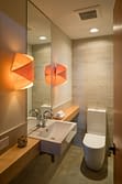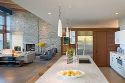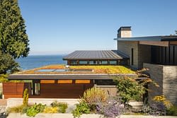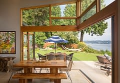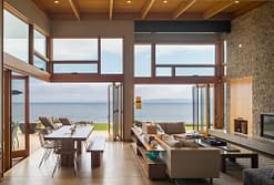 This shoreline home is a 2800 square foot, 2-bedroom Pacific Northwest-style house anchored into a steep-sloped site. There is an open-concept living, dining, and kitchen area that opens directly to the outdoors with a corner bi-fold door system. A stone mass wall divides the public and private spaces of the house while enclosing the stairs, support areas, and powder room. There are many nature-inspired elements in this home such as pendant light fixtures in the kitchen that are reminiscent of shells and wood-grained tile in the master bath.