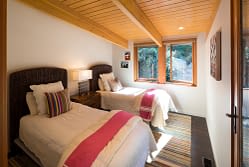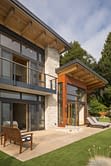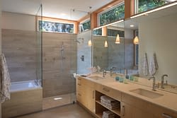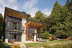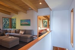 The two homes, Seaview Escape and Island Retreat, also share an extensive outdoor living space and amenities such as eating and barbecuing areas, showers, and a hot tub. Care was taken when positioning the houses on the property so that neither blocks the Puget Sound view of the other.