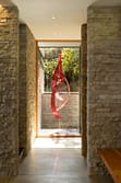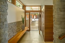 The hillside waterfront property has been in the clients’ family since the 1950s and contains two parcels that used to have a mid-century home and a 1920s cabin. The two siblings that had acquired these wanted the two homes redeveloped in conjunction with one another. They hoped they would be able to use the houses, which are just 50 feet apart, for big family gatherings to ensure their families stayed close. The existing site topography was maintained to minimize earth disturbance on the steep slope and the new homes were built on the existing footprint. Each home includes a material palette of stone, concrete, wood, and metal, complimenting one another while defining the subtle differences in the siblings’ personal tastes. Both utilize a stone mass wall to delineate the private spaces from the shared central public spaces. The site is accessed by a communal drive shared between the two homes, providing a unique overlook of the cantilevered green roof.